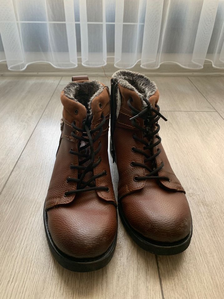 Kahverengi deri, kürklü astarlı kadın botları. Dolgu topuklu, desen içermeyen bu botlar günlük sokak stiline uygun, rahat ve şık bir görünüme sahiptir.