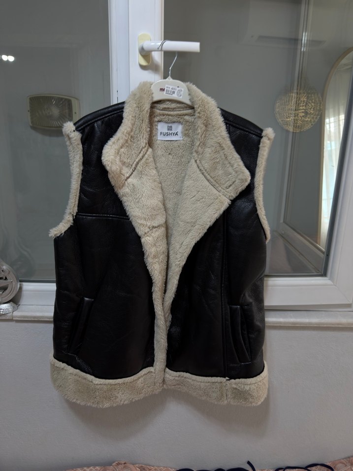 Kahverengi Deri Kürklü Kolsuz Ceket
