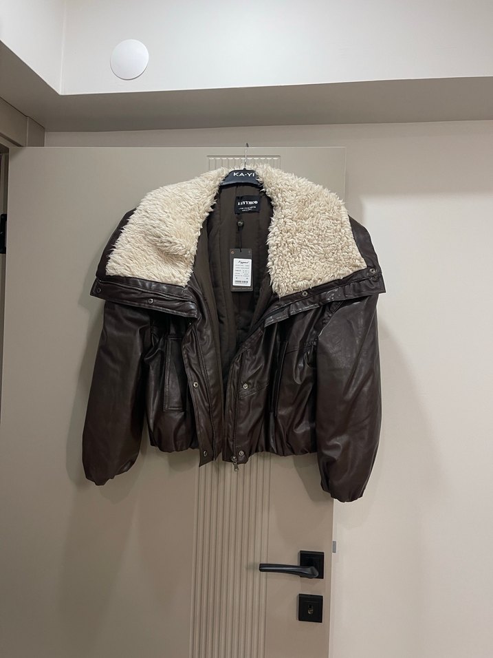 Kahverengi deri, kürklü detaylı, yakalı midi ceket. Bol kesim, askılı kollu ve günlük kullanıma uygun uzunlukta.