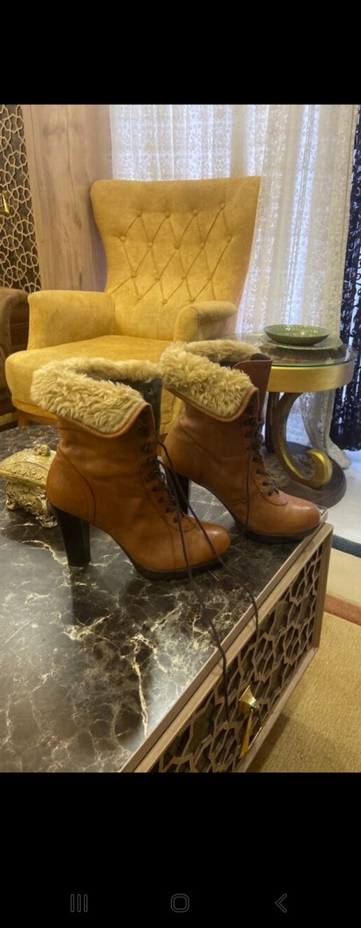 Kahverengi deri platform topuklu kadın botları, kürk detaylı ve parlak yüzeyli, rahat bohem tarzda.