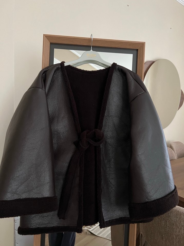Kahverengi Deri Kuşaklı Midi Ceket