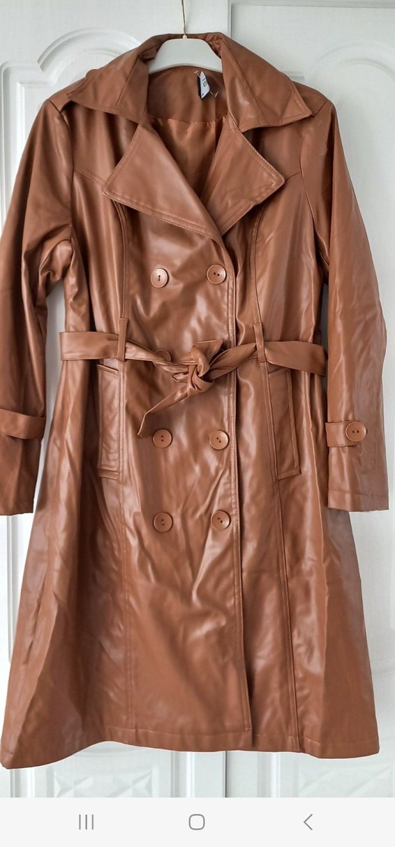 Deri mont 44 beden Kol arasi 52 Omuz42 Boy 98 cm. Parlak kahverengi deri trençkot, kesimli yaka ve kuşaklı bel ile şık bir görünüm sunar. Askılı kollar ve çift düğmeli ön tasarımda, trendy casual tarz için uygundur.