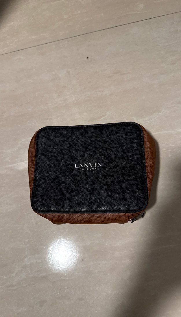 Kahverengi deri malzemeden yapılmış, fermuarlı ve baskılı desenli Lanvin marka makyaj çantası. Günlük kullanım için sade ve şık tasarım sunar.