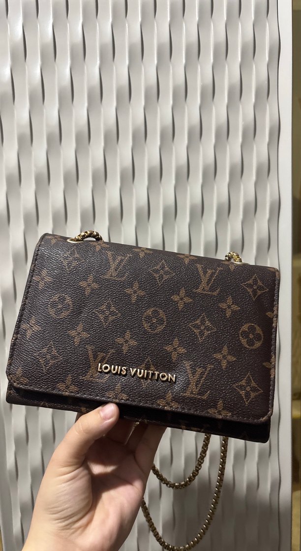 Louis Vuitton marka, kahverengi deri, baskılı desenli, tokalı kadın çantası. Klasik zarafeti modern şıklıkla birleştirir. Günlük kullanıma uygun.