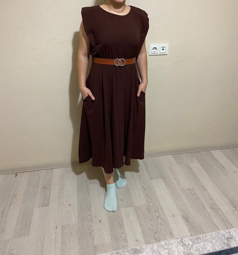 Koyu kahverengi deri midi elbise, bol kesim, bisiklet yaka ve askılı kollara sahiptir. Kemerli ve cepli, günlük rahat kullanım için uygundur.