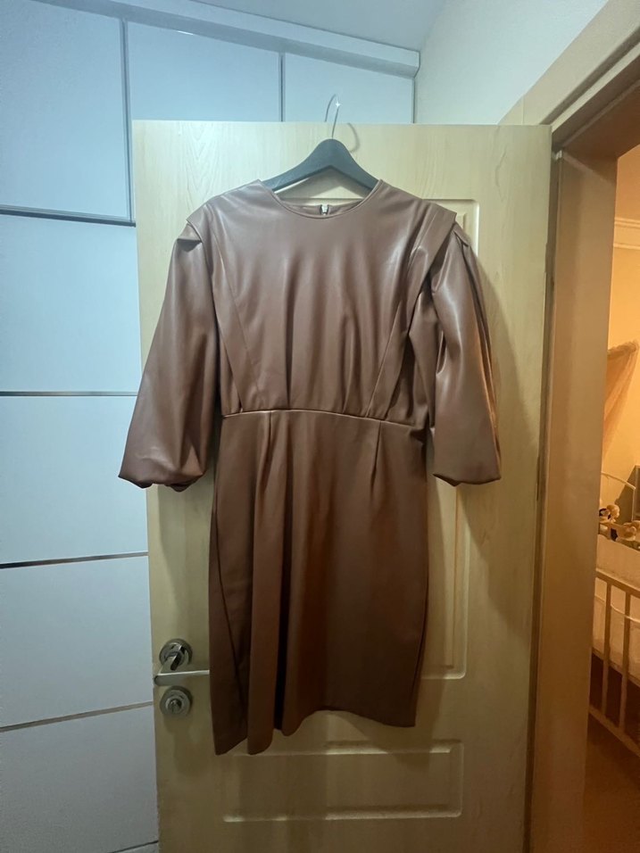 Kahverengi deri midi elbise, ince kesim, bisiklet yaka detayına sahiptir. Yarım kol , desen içermeyen yüzeyiyle ofis için uygundur.