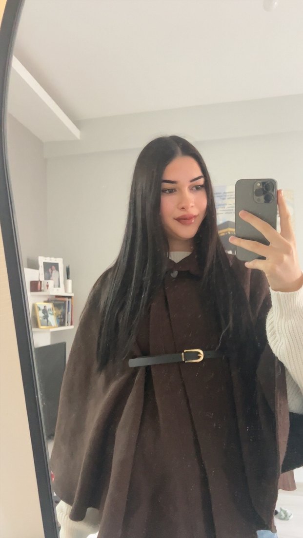 Kahverengi deri midi uzun kollu panço, bol kesim ve yüksek yakasıyla rahat ve şık bir görünüm sunar.