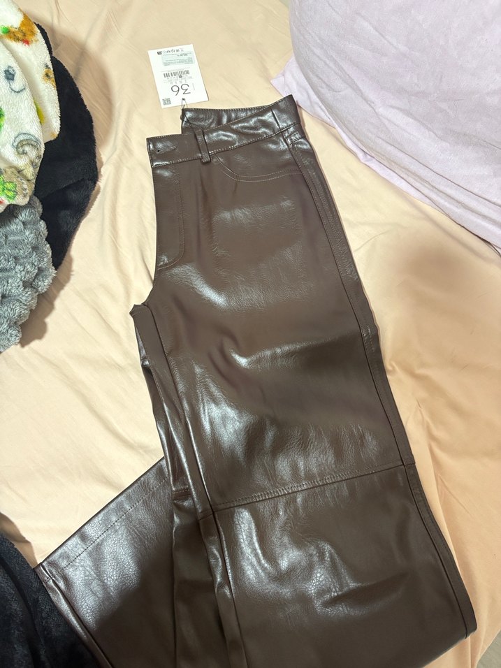 Kahverengi deri midi kadın pantolon, normal boy ve kemerli, günlük sokak stili için uygun, düz yüzeyli.