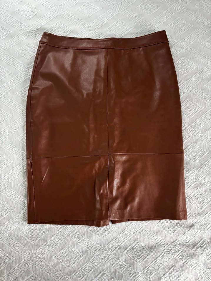 Kahverengi deriden, kemerli ve düz tasarıma sahip, ofis için uygun, minimalist tarzda, fitted midi etek. Kahverengi kısa deri etek. Hiç giyilmedi. Bel 36 santim. Boy 51 santim.