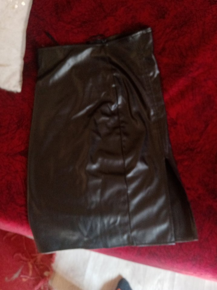 Kahverengi deri, drapeli, gövdeye oturan midi şort. Cesur ve gotik tarzda, romantik akşamlar için uygun, desen içermeyen rahat bir model.