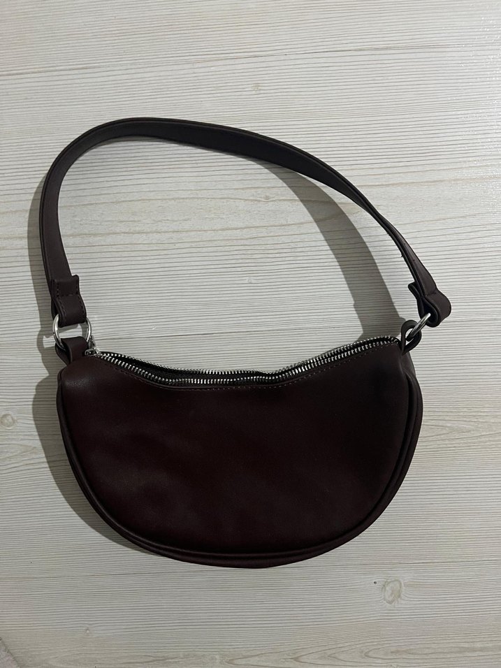 Kahverengi deri minimal tasarımlı, tokalı askılı kadın çantası, günlük sokak stiline uygun desen içermeyen model.