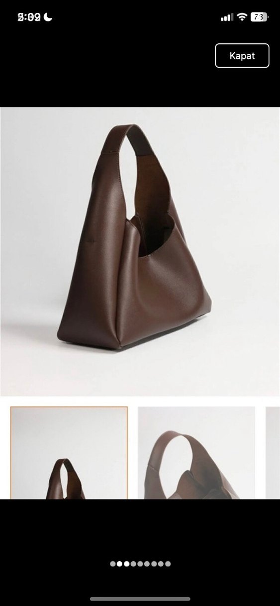 Koyu kahverengi deri kadın çanta, minimalist ve çağdaş tasarıma sahiptir. Desensiz ve yapılı formu günlük kullanımda zahmetsiz şıklık sunar.