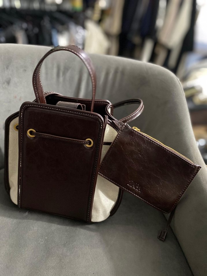 Kahverengi deri ve baskılı detaylara sahip, fermuarlı küçük cüzdanlı modern klasik kadın çantasıdır.