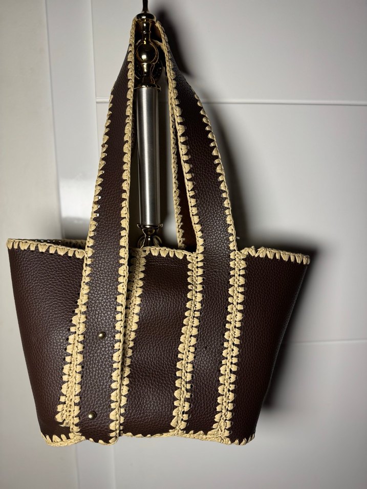 Nakışlı detaylara ve tokalı askılara sahip kahverengi deri kadın çantası. Tamamen el yapımı , Bohem ve minimalist tarzda, günlük kullanıma uygun.