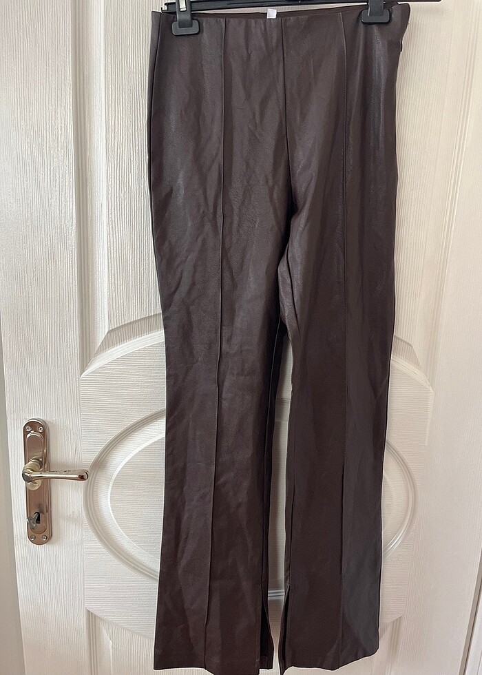 Kahverengi deri paça kısmı yırtmaçlı pantolon m beden