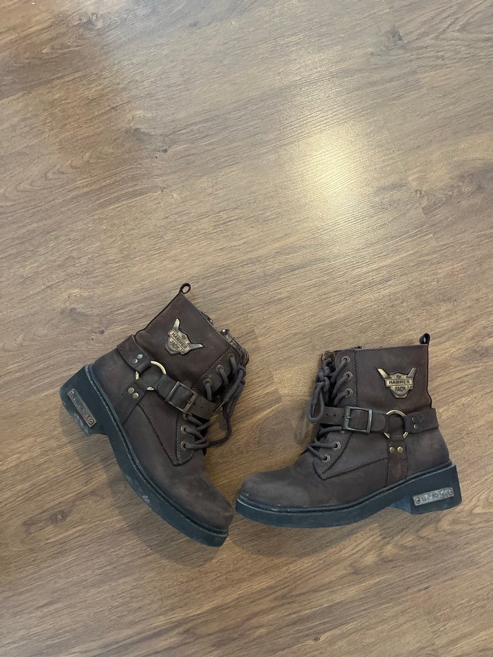 Koyu kahverengi deri platform topuklu, tokalı botlar. Leopar desenli, grunge punk tarzında günlük kullanıma uygun.