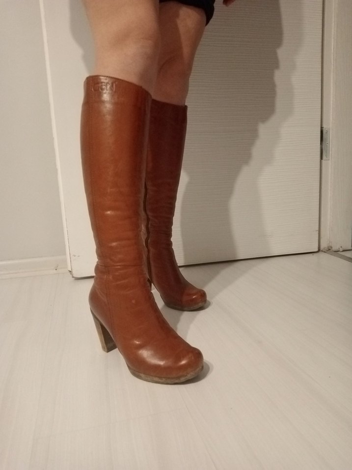 Koyu kahverengi deri diz boyu kadın çizme, platform topuklu ve tokalı detaylara sahip. Günlük kullanıma uygun, vintage bohem tarzını yansıtıyor.burin kısmında çizik var sadece kullanıma engel değil hakiki deri içi tüylü sıcak tutuyor yakından bütün görsellerini çektim iade ile ugrasmak istemiyorum