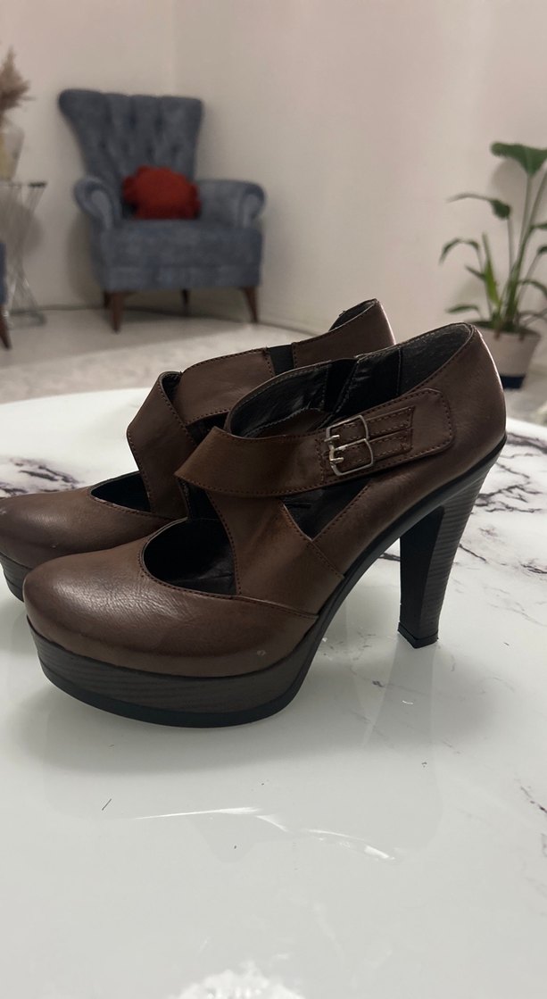 Kahverengi deri platform topuklu kadın ayakkabısı, tokalı ve çağdaş tasarıma sahip, ofis kullanımı için uygun, Paris tarzında.