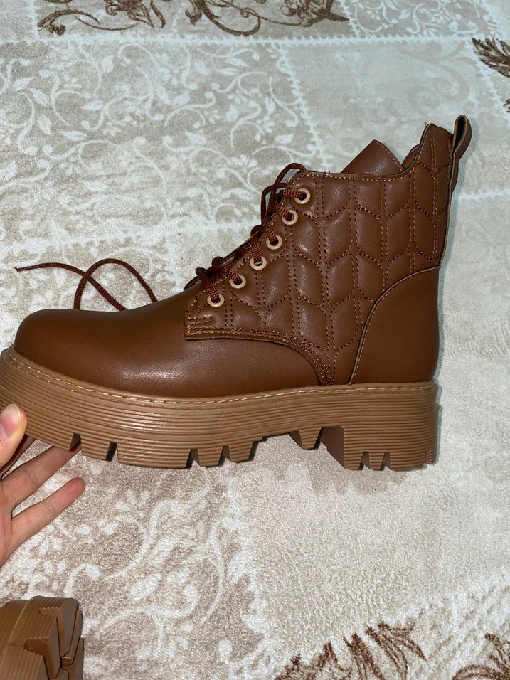 Kahverengi deri platform topuklu kadın bot, kapitone desenli ve tokalı, trend sokak stili için uygun.