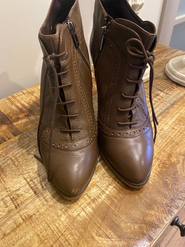 Kahverengi deri platform topuklu kadın botlar, parlak yüzeyli ve tokalı detaylara sahip, ofis için uygundur.