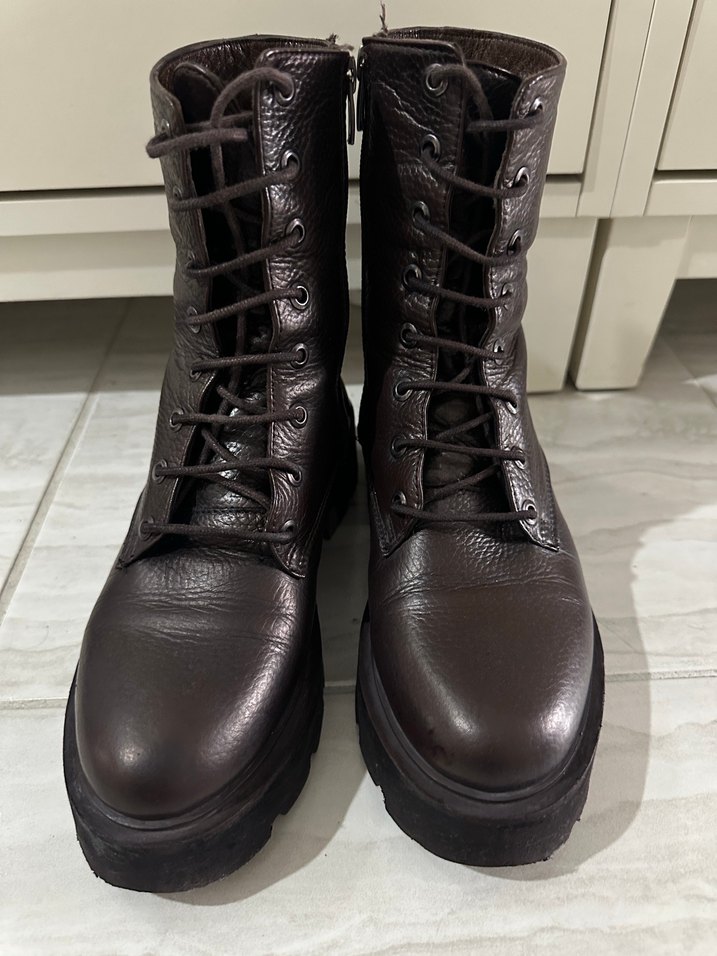 Kahverengi deri kadın bot, platform topuklu ve tokalı detaylara sahip. Günlük kullanıma uygun. Gerçek deri Nişantaşı shoes dan alınmıştır