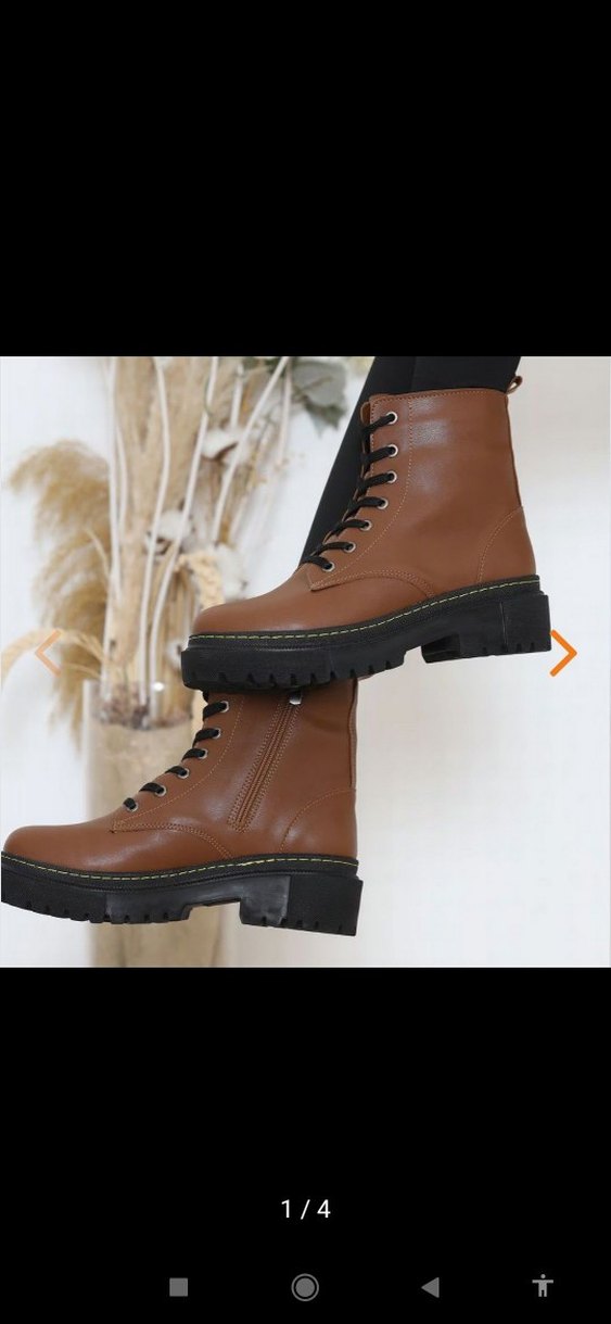 Az kullanıldı kahverengi deri, platform topuklu ve bağcıklı kadın bot. Sokak stiline uygun, günlük kullanım için ideal, desensiz ve koyu renkte.