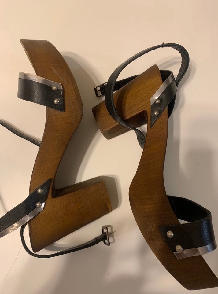 Bu kadın sandaletleri, günlük kullanım için kahverengi deri ve tokalı bantlarla çağdaş platform topuk içerir.