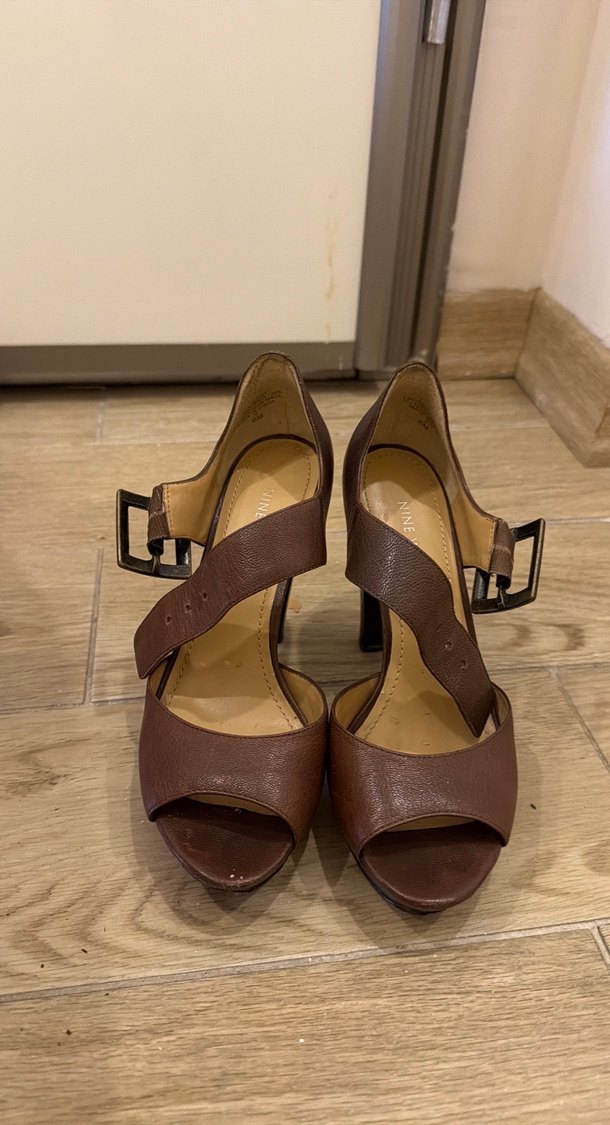 Kahverengi deri, tokalı bantlı platform topuklu kadın sandalet, minimalist ve çağdaş tasarıma sahip, ofis kullanımı için uygun.