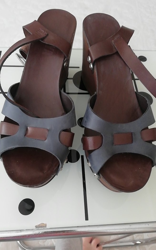Kahverengi deri platform topuklu kadın sandalet, tokalı kayışlı, minimalist ve bohem tarzda, günlük kullanım için uygun.