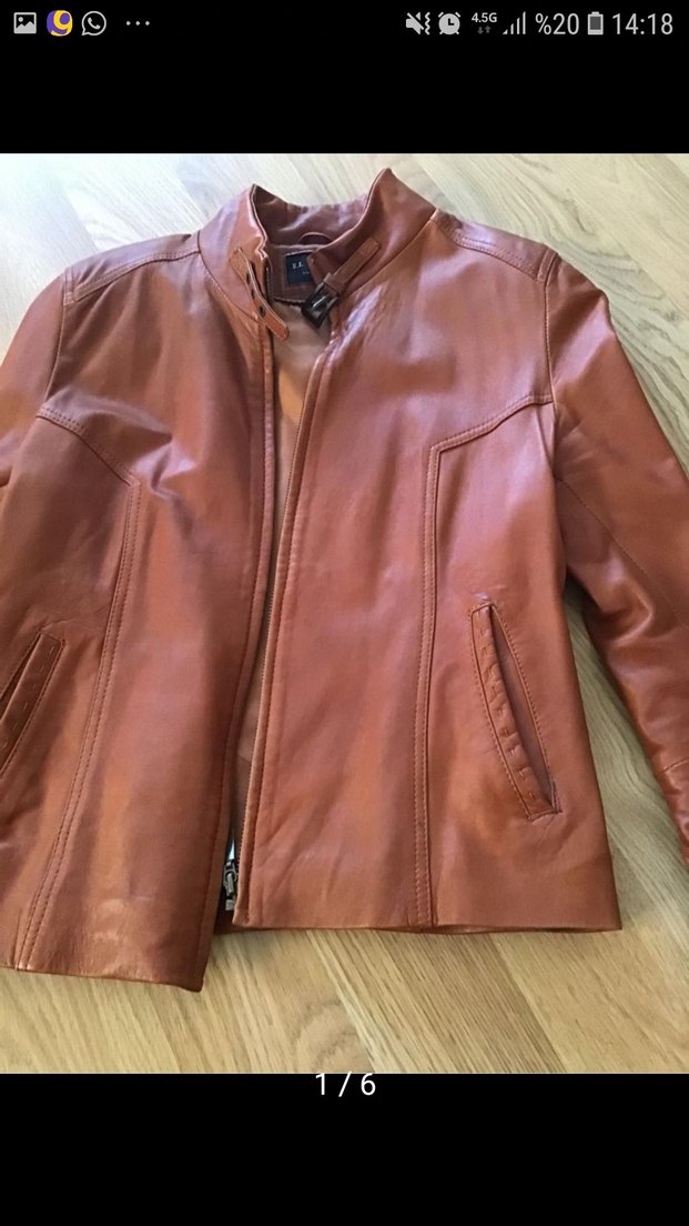 Kahverengi deri biker ceket, çıtçıtlı yakalı ve fermuarlı. Parlak görünümlü, normal kesim, uzun kollu, günlük kullanıma uygun.Gercek deri