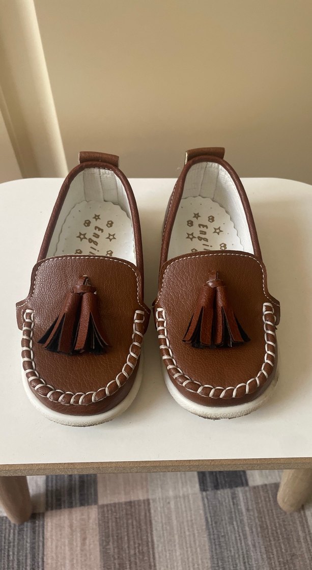 Kahverengi deri, püsküllü ve işlemeli desenli erkek çocuk ayakkabısı, klasik ve geleneksel tarzda özel günler için uygun.Doğum günü çekimde bir kere kullanıldı.