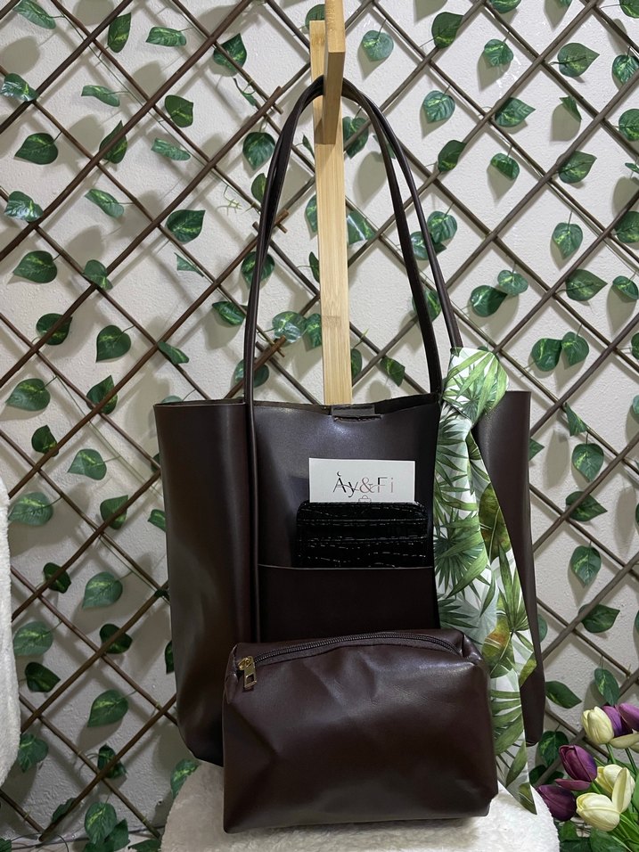 Kahverengi deri püsküllü kadın çanta, baskılı fular ve uyumlu küçük çanta ile birlikte. Üzerinde 'Ay&Fi' markası bulunur.