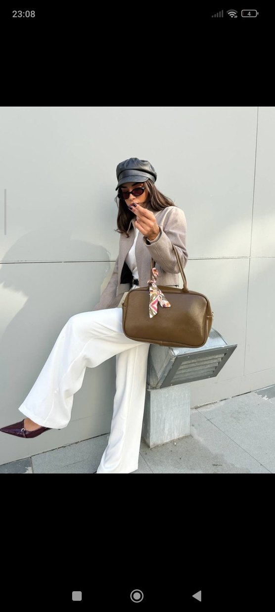 Kahverengi deri püsküllü kadın çanta, kulpuna bağlı küçük fularla sokak stiline uygun şık ve sade tasarım.