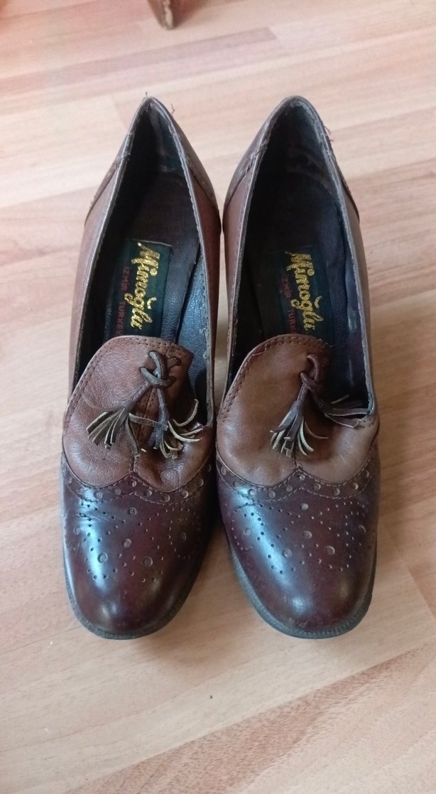 Kahverengi deri, 8.5 punto topuk boyu, püskül detaylı vintage ayakkabı.