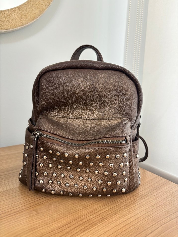 Kahverengi deri, tokalı ve zımbalı detaylara sahip sırt çantası. Rock punk tarzında, günlük kullanıma uygun.