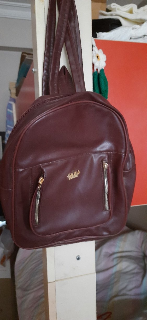 Kahverengi deri sırt çantası, parlak yüzey ve fermuarlı ceplerle günlük kullanım için minimalist sokak stili sunar.