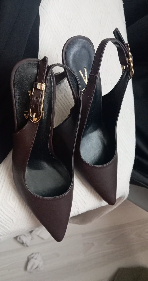 Kahverengi deri stiletto, yılan derisi desenli ve kemerli, klasik şıklık ile modern tarzı günlük kullanım için birleştirir.