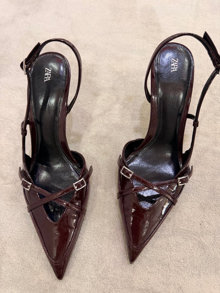 Kahverengi deri stiletto topuklu ayakkabılar, yılan derisi desenli ve tokalı kayışlarla modern ve Paris tarzı sunar, romantik akşamlar için uygundur.