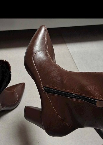 Kahverengi deri kadın botları sivri burun ve stiletto topuklu, tokalı detayıyla klasik şıklık sunar. 37-42 arası beden mevcuttur.