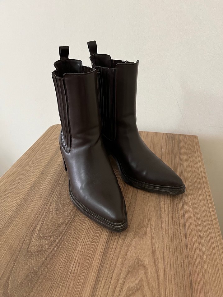 Kahverengi deri, stiletto topuklu ve tokalı kadın bot. Desensiz, gotik tarzıyla günlük kullanım için uygun. Sıcak tutar bilek üst kısmı lastikli rahattır