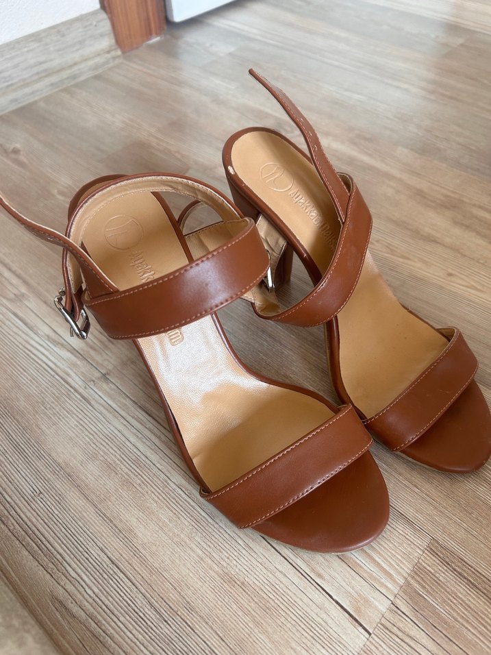 deri, parlak görünümlü, stiletto topuklu kadın sandalet. Tokalı kayışlarıyla minimalist ve klasik şıklık sunar. Sadece bir iki kez kullanıldı tertemizdir