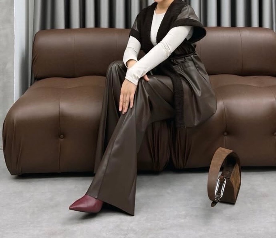 Kahverengi deri, bol paça ve uzun kesim kadın pantolon, kemerli bel detayıyla deri yelek kemer detaylı günlük kullanıma uygun rahat ve şık bir seçenek sunar.