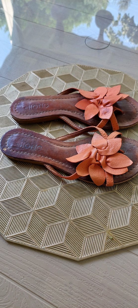 Kahverengi deri, kadın terlikler, çiçek detaylı ve tokalı, günlük kullanıma uygun vintage bohem tarzda.