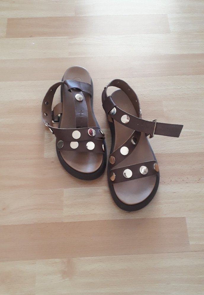 Kahverengi deri, tokalı ve dolgu topuklu sandalet. Üzerinde gümüş renkli puantiyeler bulunur. Minimalist ve retro tarzda, günlük sokak giyimi için uygundur.