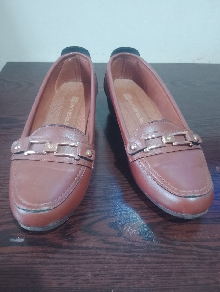 Kahverengi deri, tokalı, blok topuklu kadın ayakkabısı, klasik ve parlak görünüme sahip, günlük kullanım için uygundur.