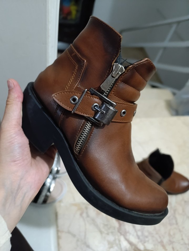 Parlak kahverengi deri biker bot, tokalı ve fermuarlı, kalın topuklu. Sokak stiline uygun, günlük kullanım için ideal.