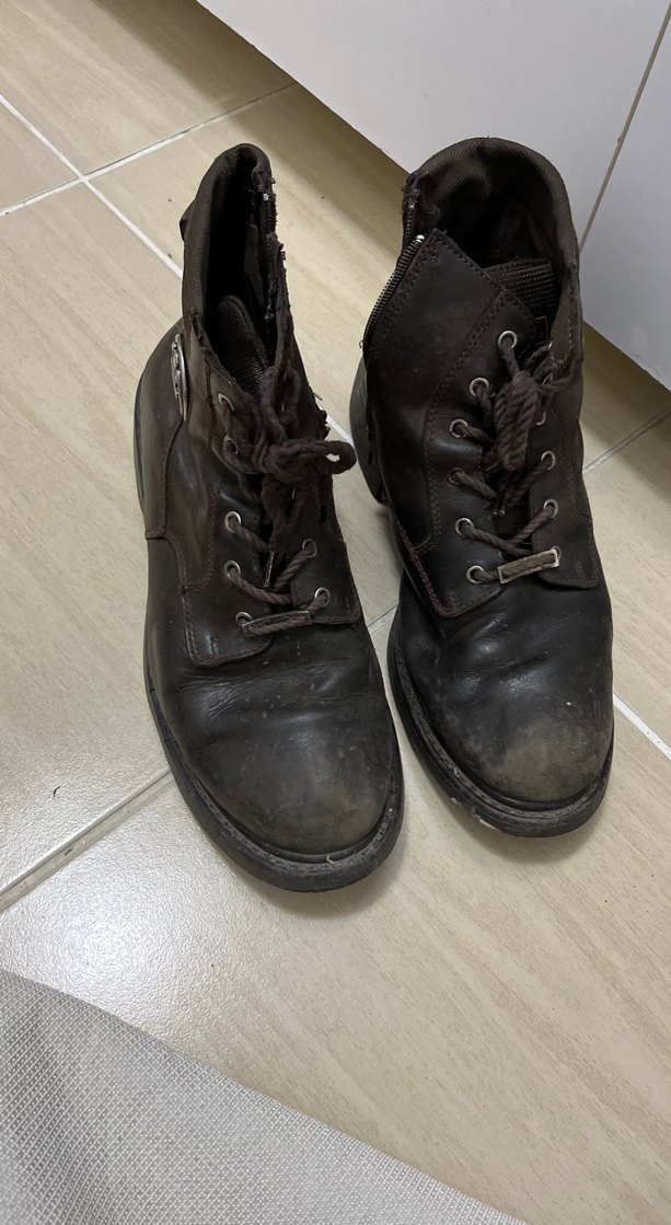 Koyu kahverengi deri biker botlar, tokalı ve bağcıklı detaylara sahip, günlük kullanıma uygun grunge punk tarzında.