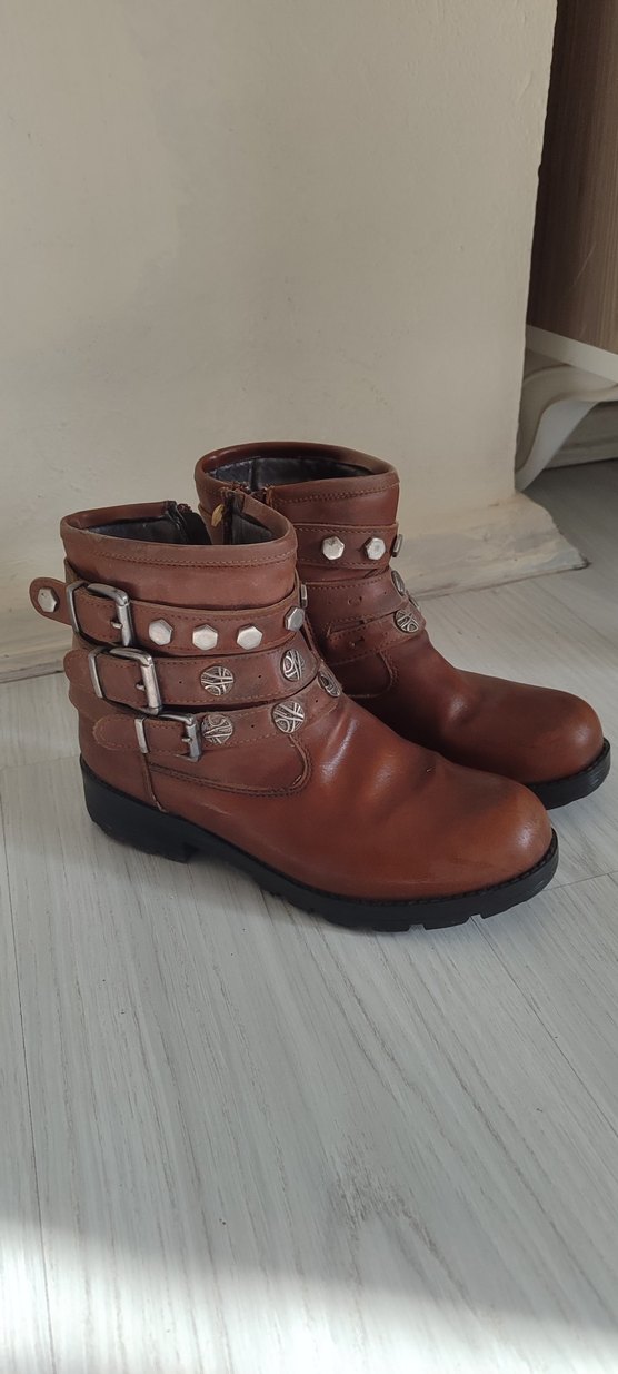 Kahverengi deri biker botlar, tokalı kayışlar ve kalın topuklu, parlak yüzeyli. Günlük kullanıma uygun, vintage bohem tarzda.
