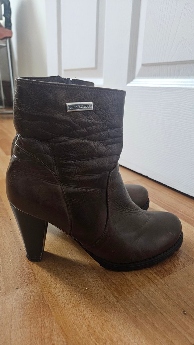 Kahverengi deri, tokalı biker botlar yüksek topuklu. Günlük rahat ve trend görünüm sunar. Desensiz sade tasarım. 37 numara