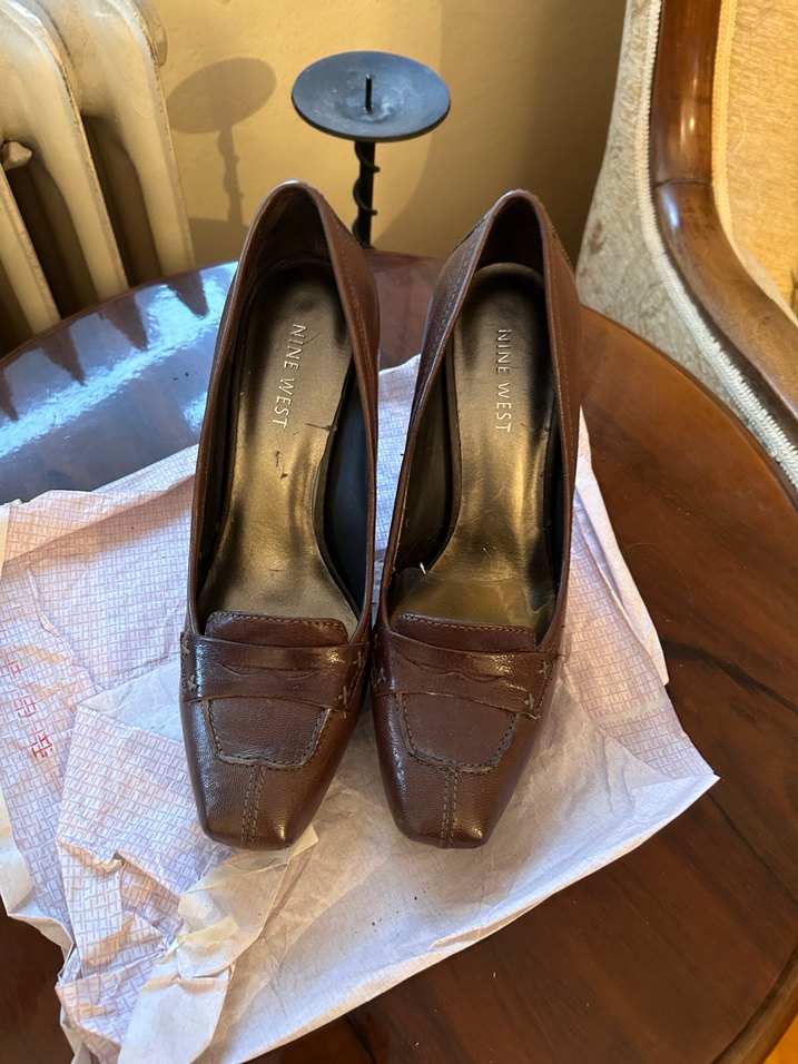 Kahverengi deri stilettolar parlak yüzeye ve blok topuğa sahiptir. Klasik, çağdaş tarzda ve tokalıdır, ofis kullanımı için uygundur.